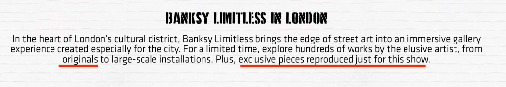 One can wonder how it is possible to market the content as “Museum Quality”, and “For a limited time, explore hundreds of works by the elusive artist, from originals to large-scale installations. Plus, exclusive pieces reproduced just for this show“? Of course, there will be no originals or “exclusive pieces reproduced just for this show”. Are there no marketing laws nowadays in the UK?