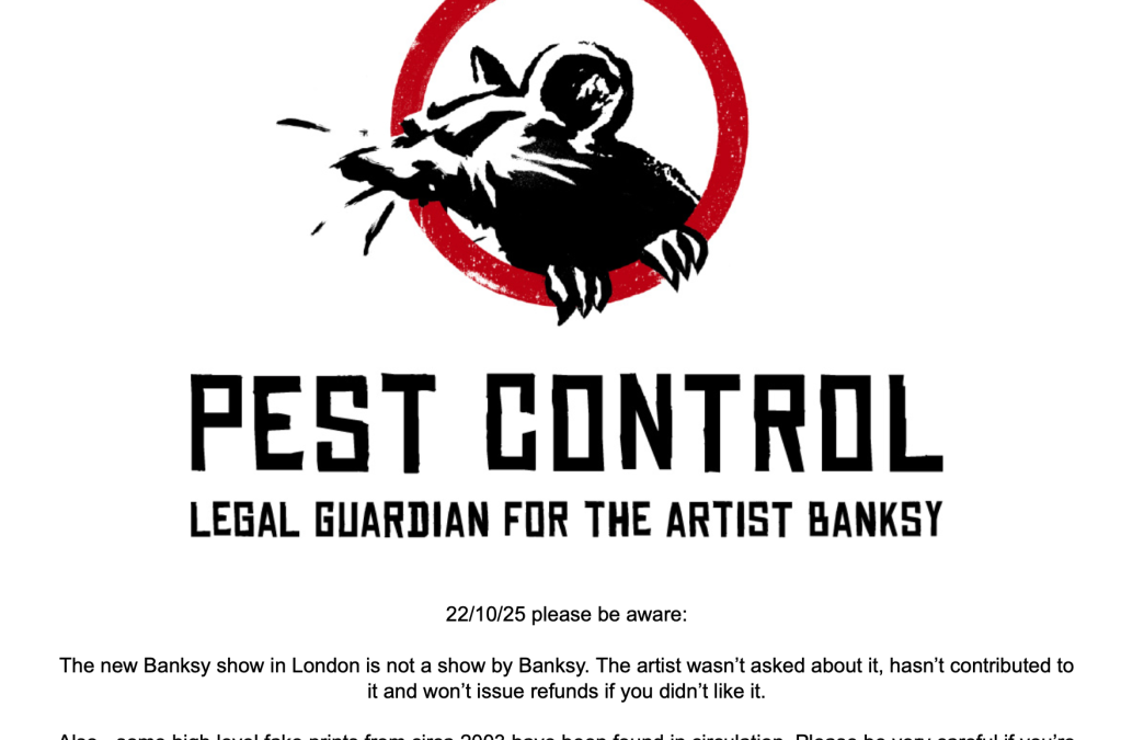 Unauthorised exhibitions of fake Banksy artwork are an ongoing concern for Team Banksy and their legal guardian, the Pest Control Office. On the redesigned frontpage of the Pest Control website (https://pestcontroloffice.com), there is now a warning about a new, unauthorised fake exhibition in London. It seems to be the first time one of these counterfeit exhibitions has appeared in the UK.